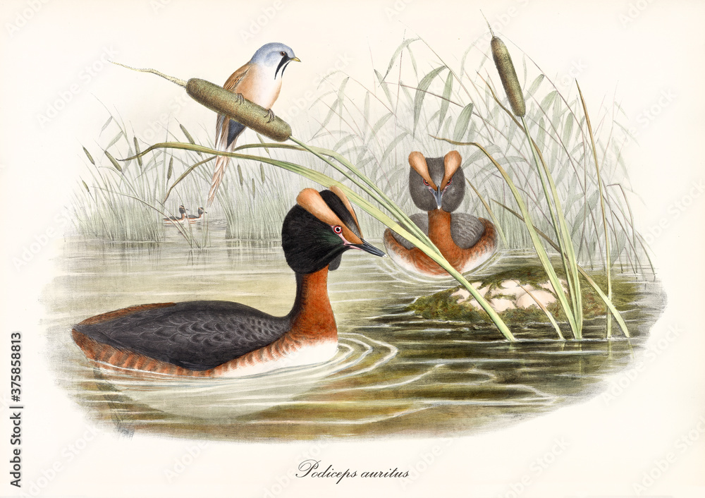 Obraz na plátně Two long necked aquatic birds with a strange head shape Horned Grebe (Podiceps auritus) in the green water of a pond surrounded by aquatic vegetation