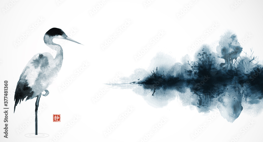 Obraz na plátně Ink wash painting with heron and misty island with forest trees