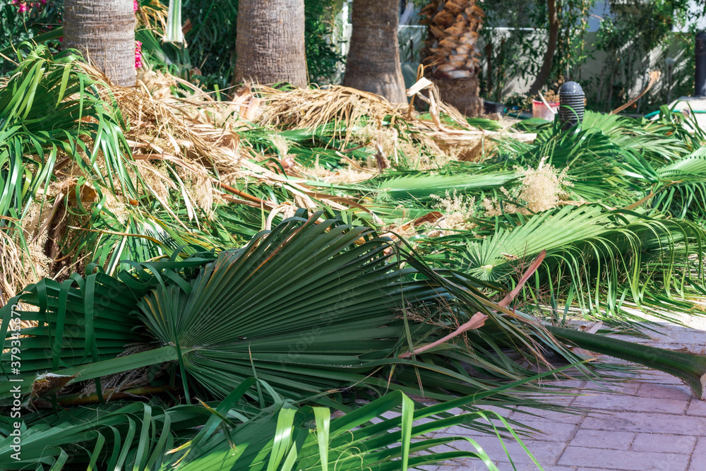 Obraz na plátně Palm branches leaves trimmed by a gardener, cleaning and cutting palm trees