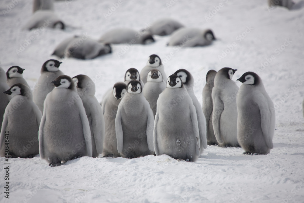 Obraz na plátně Antarctica emperor penguin chicks close up on a cloudy winter day