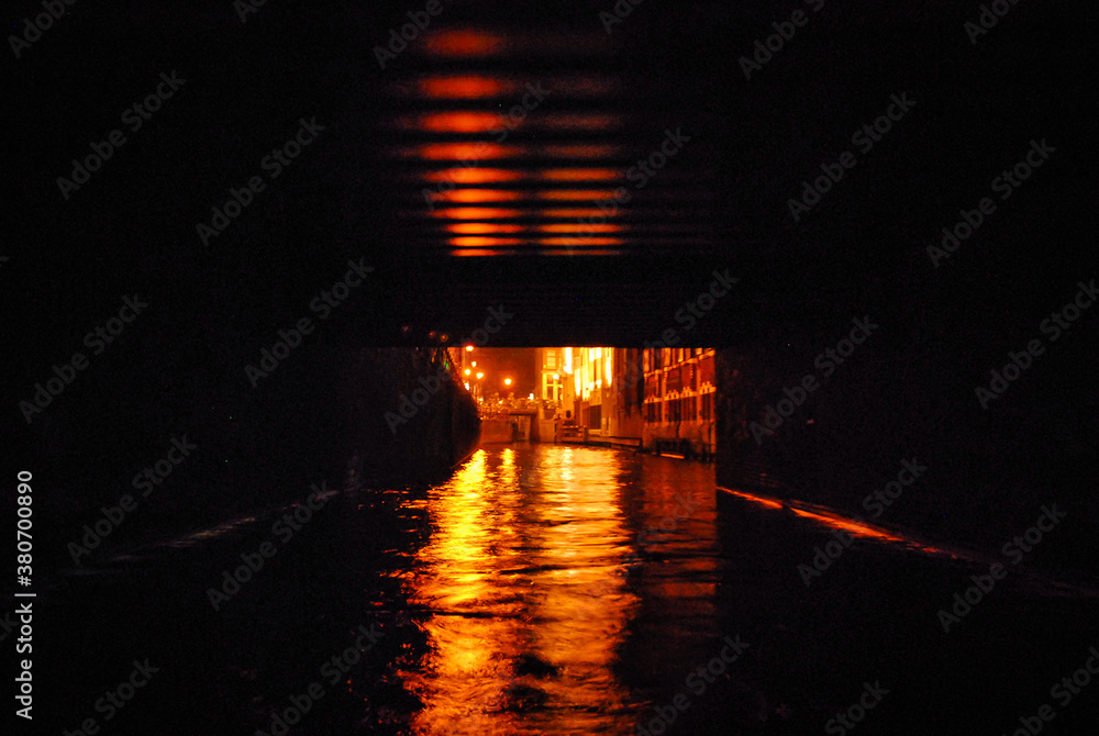 Obraz na plátně Toursist trip on little boat in the canal of Amsterdam, under bridge, The Nederl