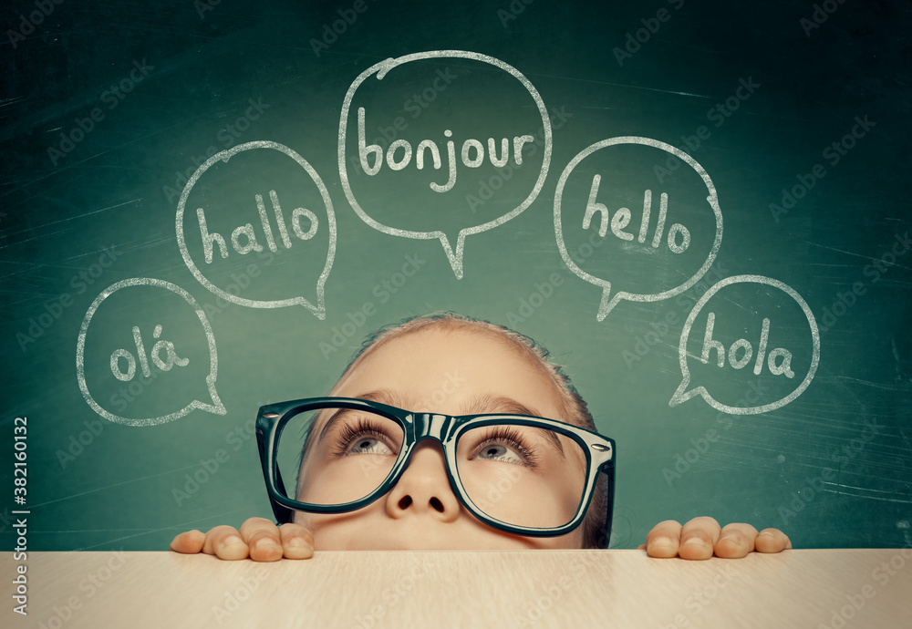 Obraz na plátně Beautiful cute little girl with eyeglasses hiding under table and looking at hello word in french, english, spanish, portuguese and german in speech balloons