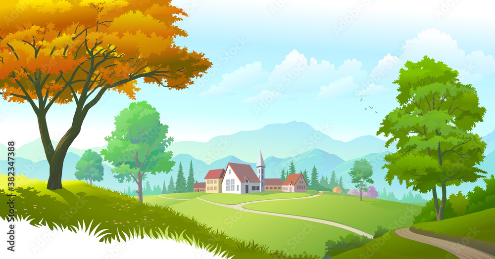 Obraz na plátně A little township in the middle of green meadows and surrounded by trees and mountains