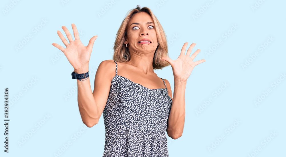 Obraz na plátně Beautiful caucasian woman wearing summer dress afraid and terrified with fear expression stop gesture with hands, shouting in shock