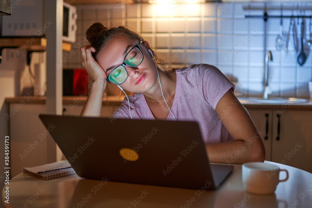Obraz na plátně Sleeping overworked woman workaholic in headphones fell asleep in the workplace