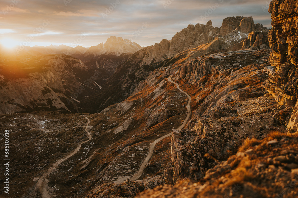 Obraz na plátně Sunset from Tre Cime di Lavaredo Drei Zinnen into the valley
