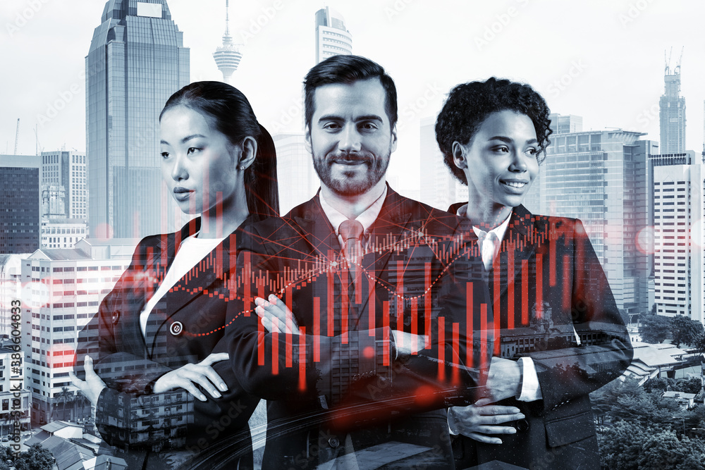 Obraz na plátně Group of business colleagues in suits as a part of multinational corporate team working on forecasting trading corporate strategy at fund