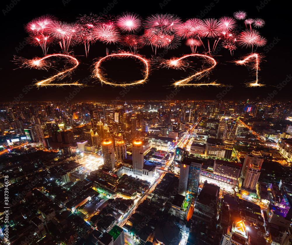 Obraz na plátně 2021 happy new year fireworks over Bangkok cityscape at night, Thailand