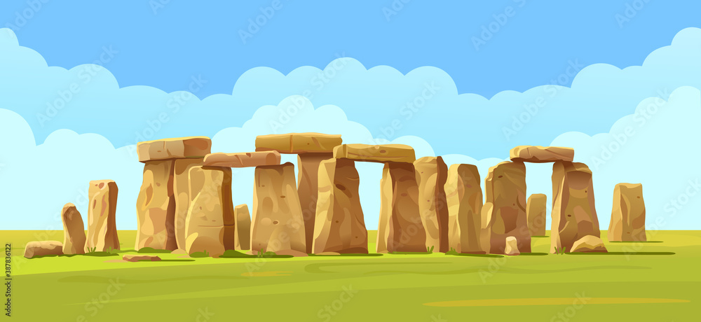 Obraz na plátně Stonehenge stone landscape on the field, blue sky and clouds