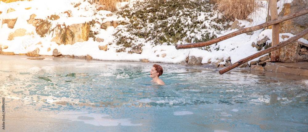 Obraz na plátně bathing young woman in a frozen lake after sauna