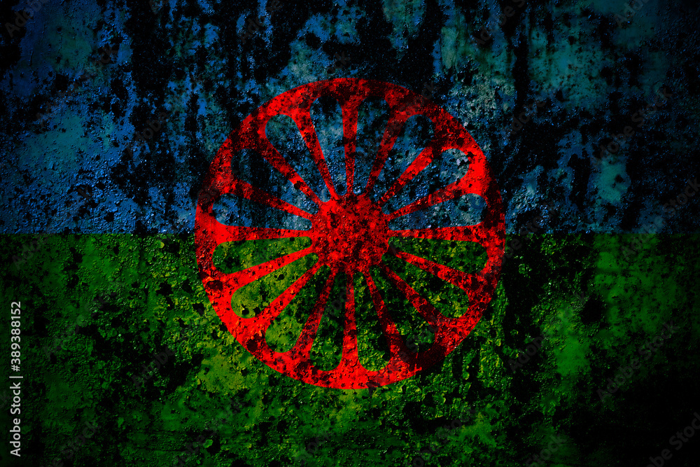 Obraz na plátně Gipsy flag on grunge metal background texture with scratches and cracks