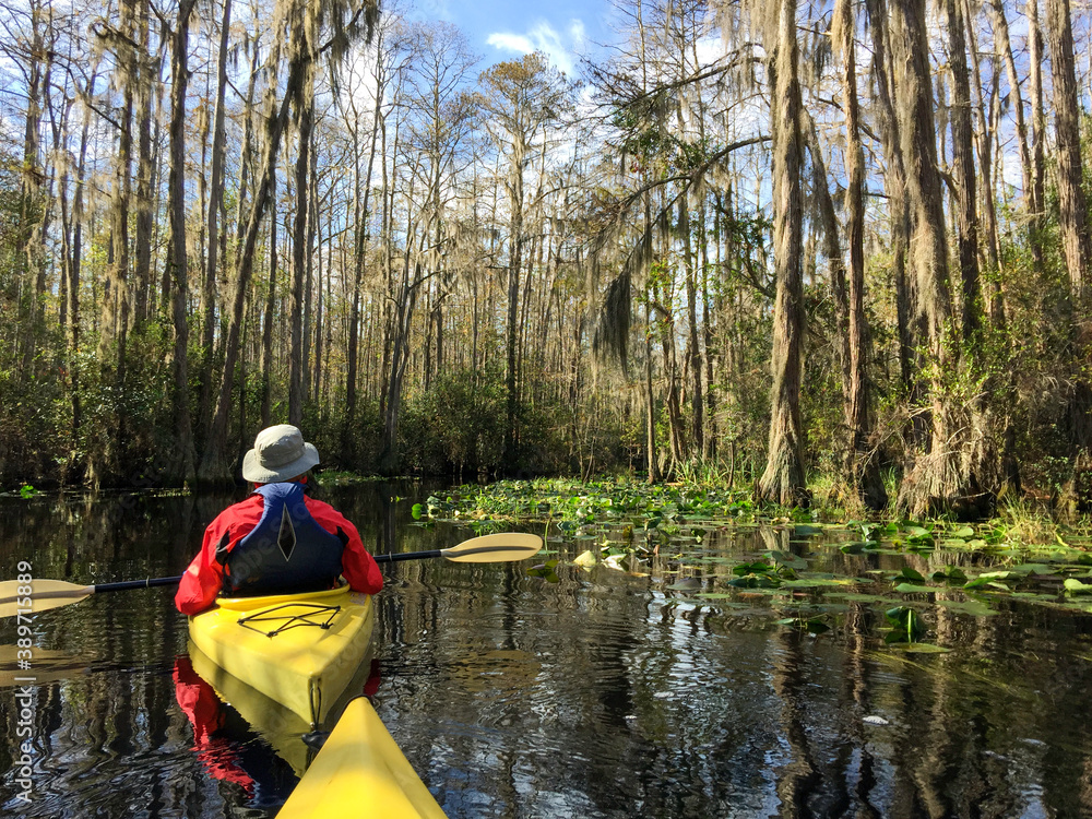 Obraz na plátně A couple in kayaks paddling through the great blackwater swamp at Okefenokee national wildlife refuge near Folson, Georgia USA