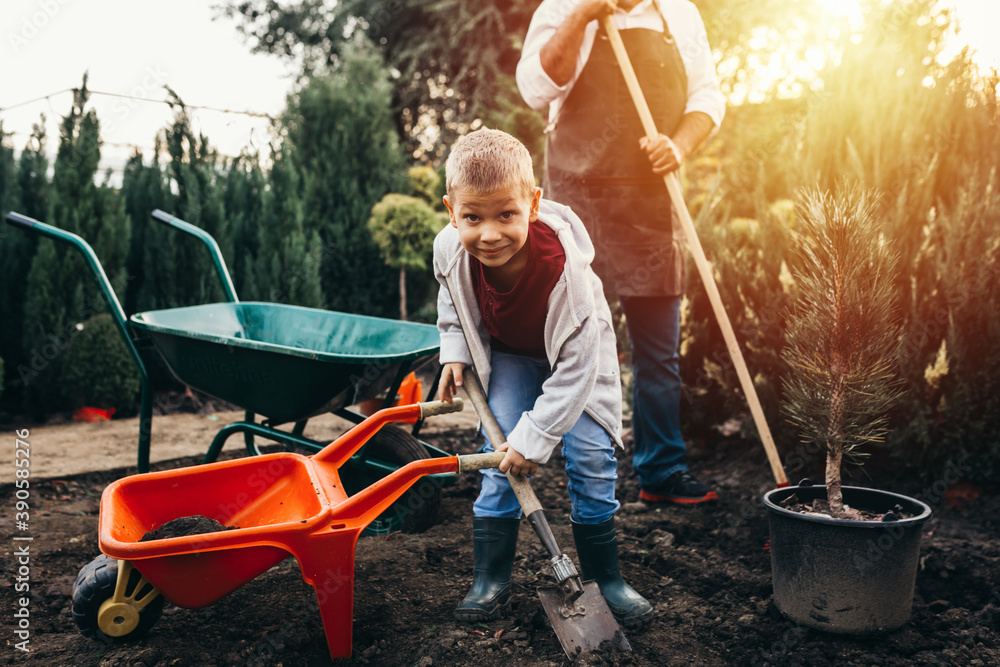 Obraz na plátně little boy with his grandfather in family tree nursery