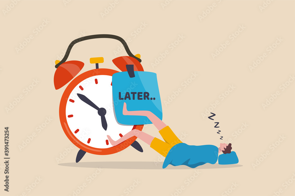 Obraz na plátně Procrastination do it later, postpone to work tomorrow, unproductive and excuse concept, lazy man sleeping with no clue to wake up with big sticky note written the word later on alarm clock