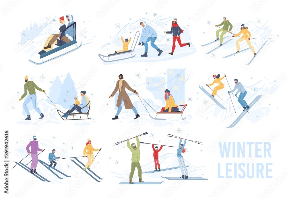 Obraz na plátně Set of flat cartoon family characters doing winter outdoor sport activities,skii