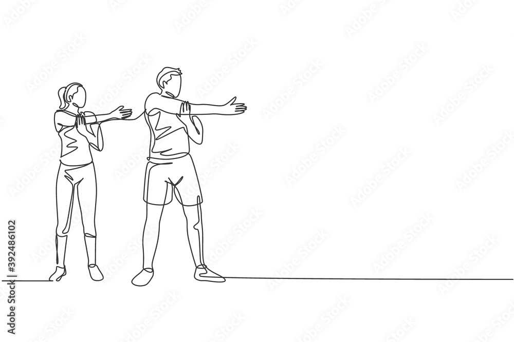 Obraz na plátně Single continuous line drawing of young sportive man and woman training warm up together in sport gymnasium club center