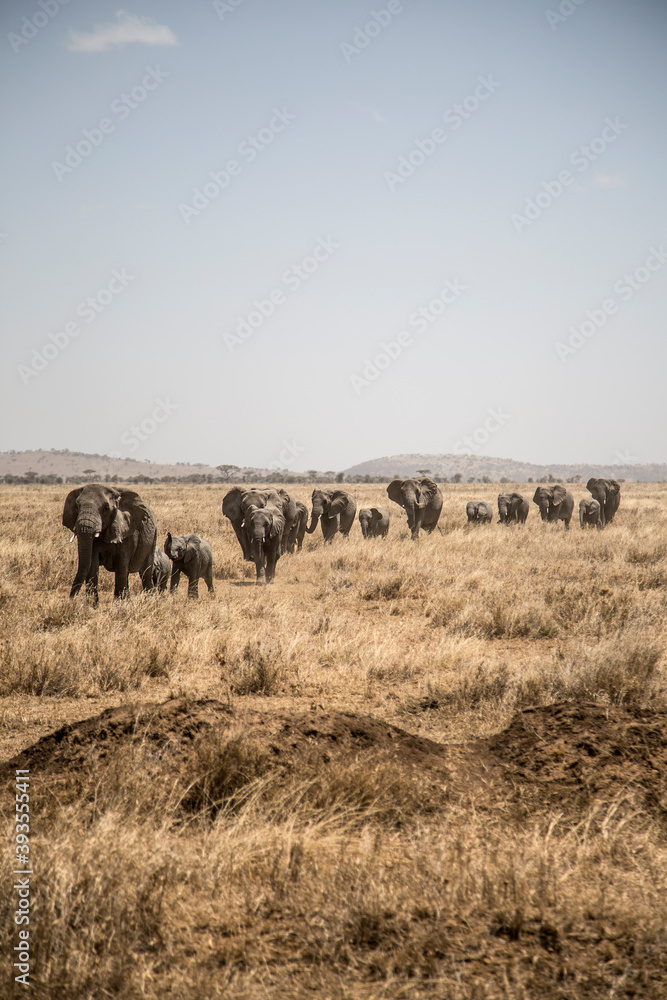Obraz na plátně Group of elephants walking through the african savanna
