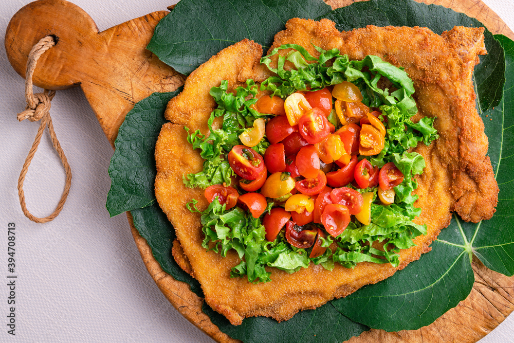 Obraz na plátně Veal milanese (cotoletta alla milanese) with fresh vegetable and tomatoes, salad close-up on a plate