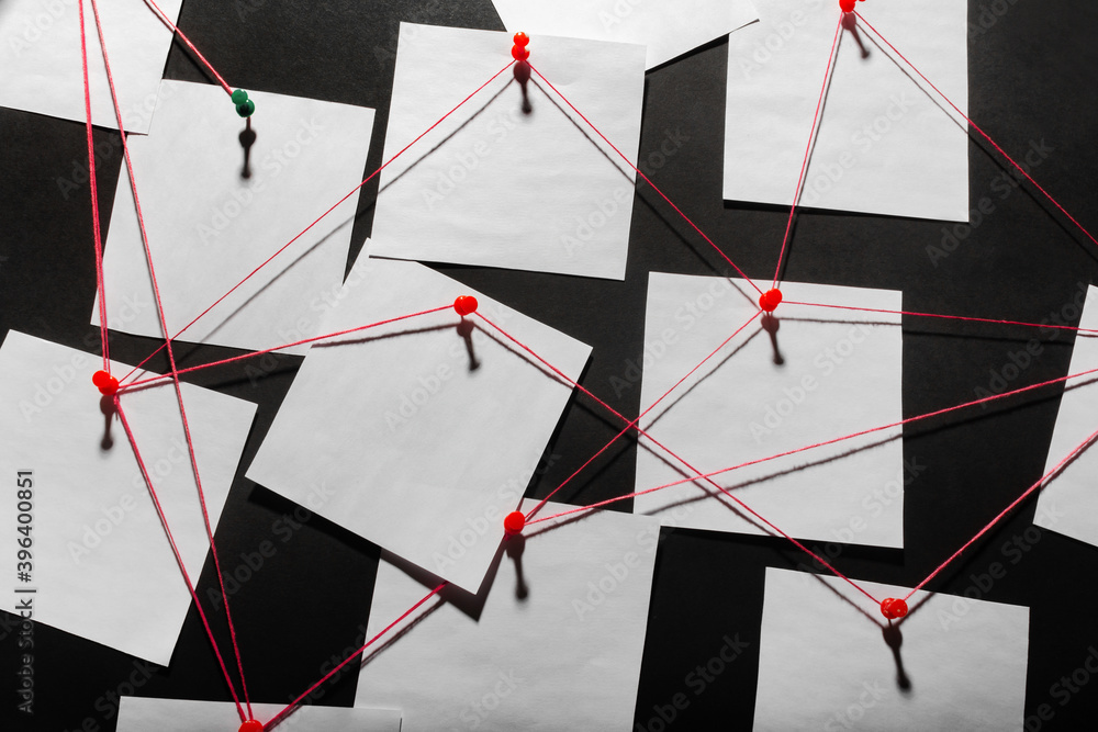 Obraz na plátně Photo of a black detecftive board with blank paper linked by red thread