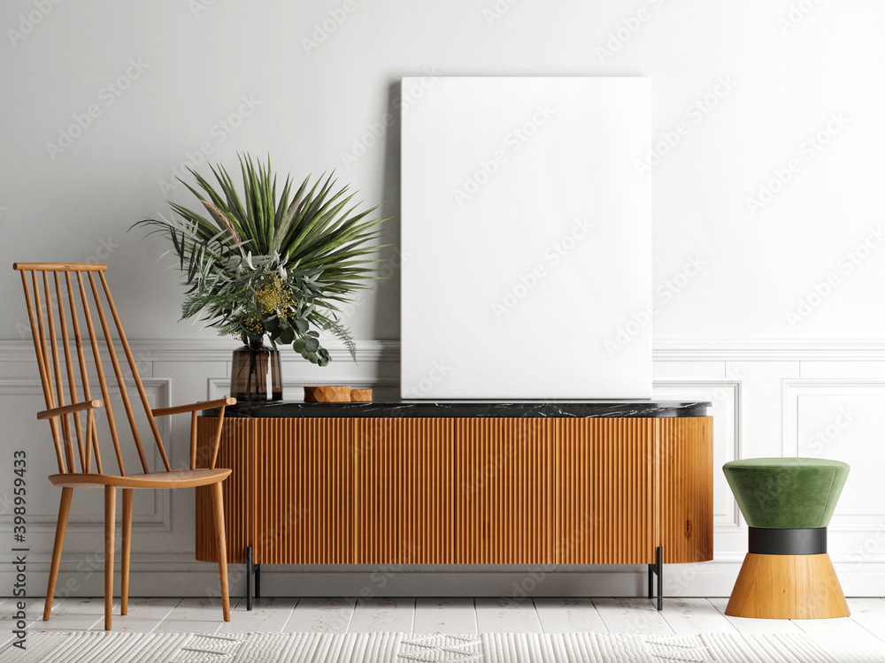 Obraz na plátně Mockup poster on the TV stand, retro style with home decoration, 3d render, 3d i