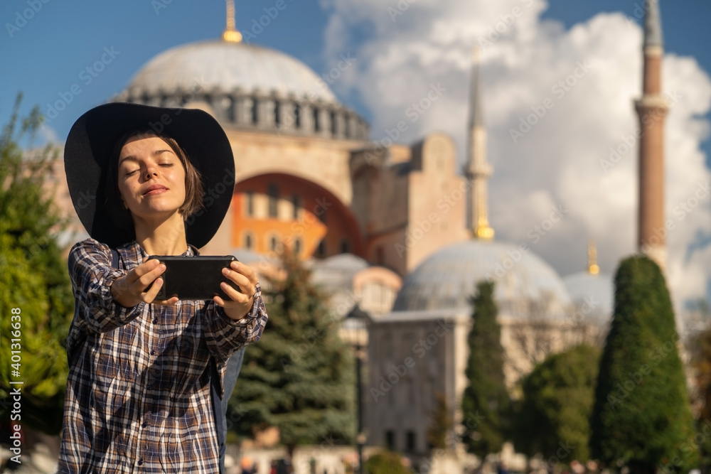 Obraz na plátně A young pretty girl in a stylish hat and a plaid shirt poses, makes a selfie on the phone near to the Hagia Sophia mosque