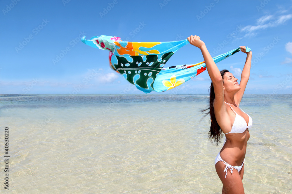 Obraz na plátně Woman at the beach holding sarong up in the air