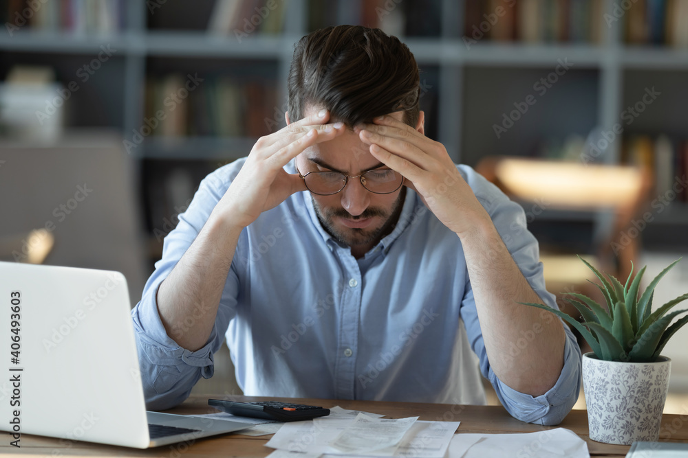 Obraz na plátně Frustrated young man in glasses sitting at table, feeling stressed calculating earnings or domestic expenses