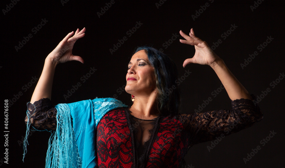 Obraz na plátně Bailadora de flamenco profesional, sesión en estudio sobre fondo negro