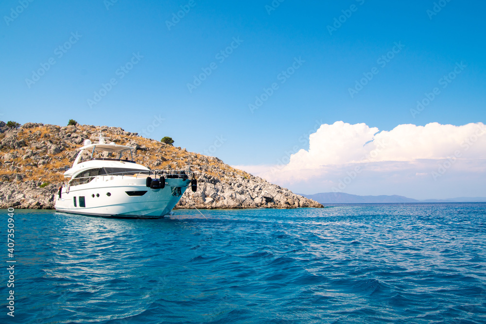 Obraz na plátně A white luxury yachting boat anchored in a turquoise color wonderful sea bay