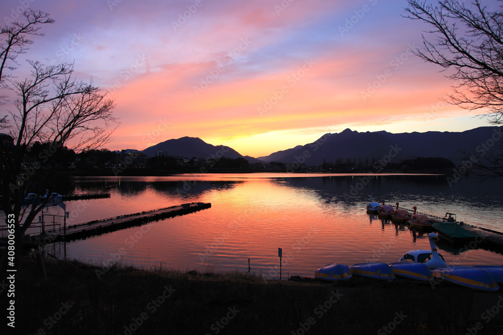 Obraz na plátně Lake Kawaguchi near Mount Fuji at sunset in Kawaguchiko, Yamanashi, Japan