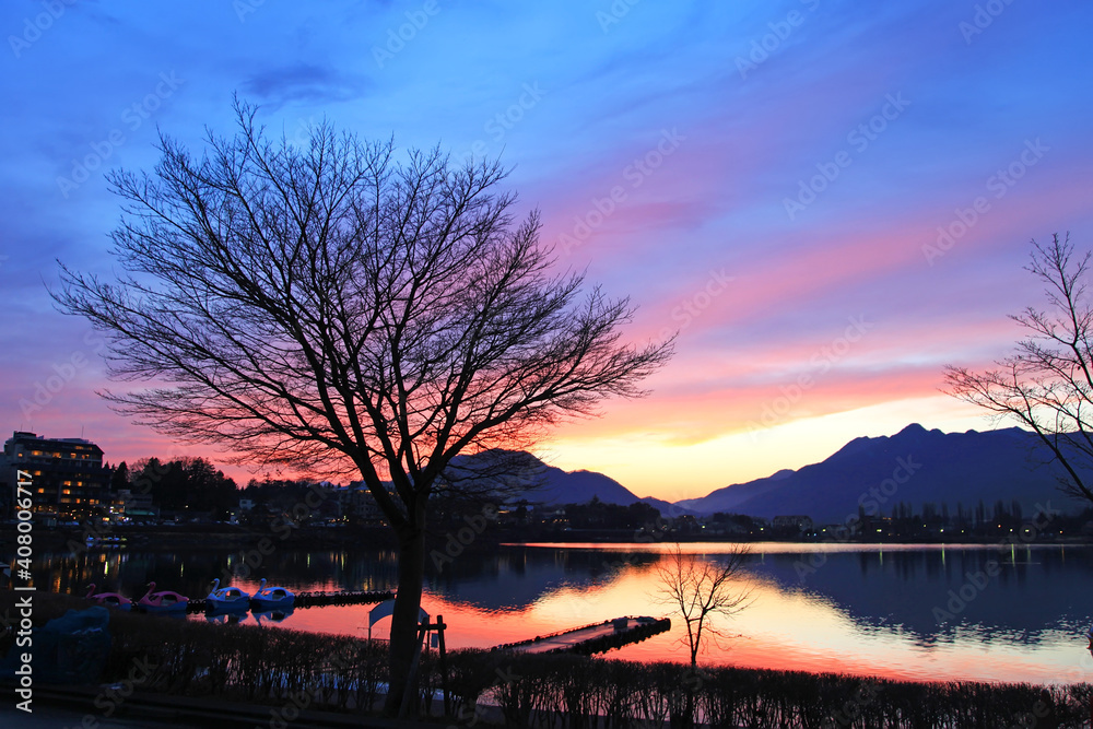 Obraz na plátně Lake Kawaguchi near Mount Fuji at sunset in Kawaguchiko, Yamanashi, Japan