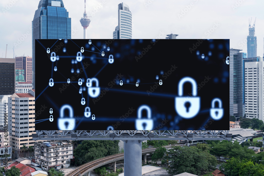 Obraz na plátně Padlock icon hologram on road billboard over panorama city view of Kuala Lumpur at day time to protect business, Malaysia, Asia