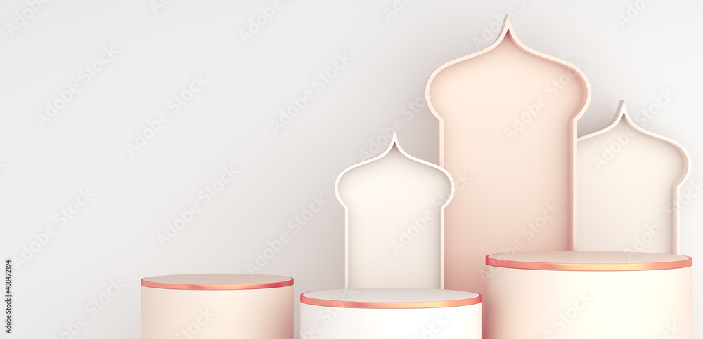 Obraz na plátně Islamic display podium decoration background on white, ramadan kareem, mawlid, iftar, isra miraj, eid al fitr adha, muharram, copy space text area, 3D illustration