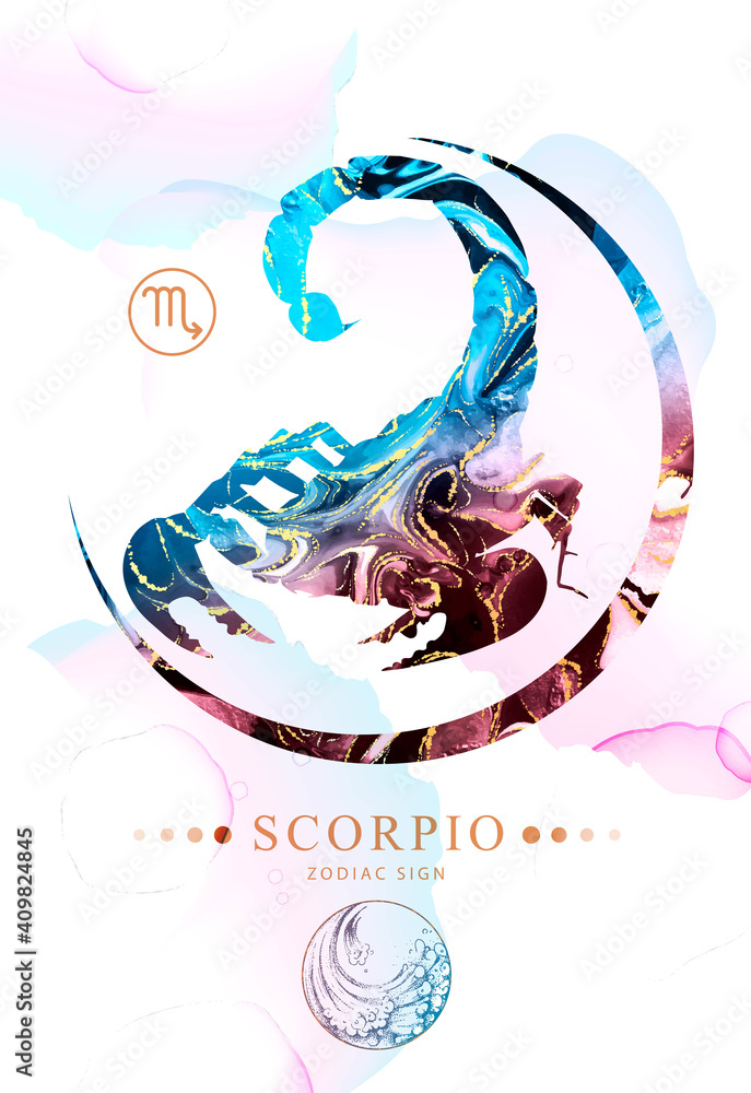 Obraz na plátně Modern magic witchcraft card with astrology Scorpio zodiac sign with alcohol ink texture