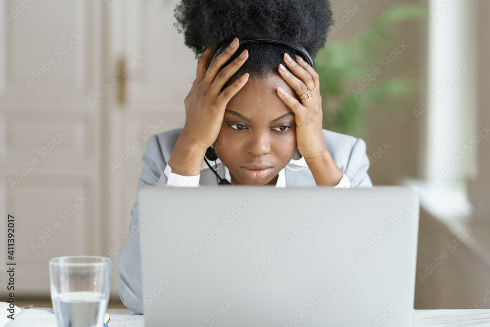 Obraz na plátně Portrait of tired annoyed afro businesswoman, wear headphones, talking to a bad customer looking at screen laptop in office