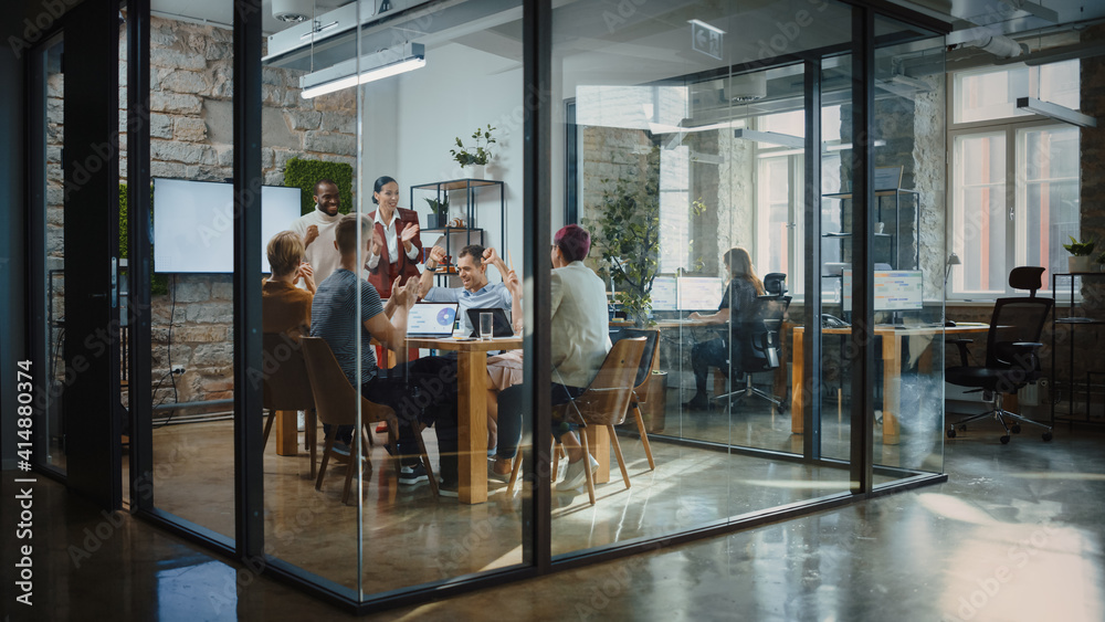 Obraz na plátně In the Stylish Modern Office Meeting Room: Diverse Group of Business Growth Mark