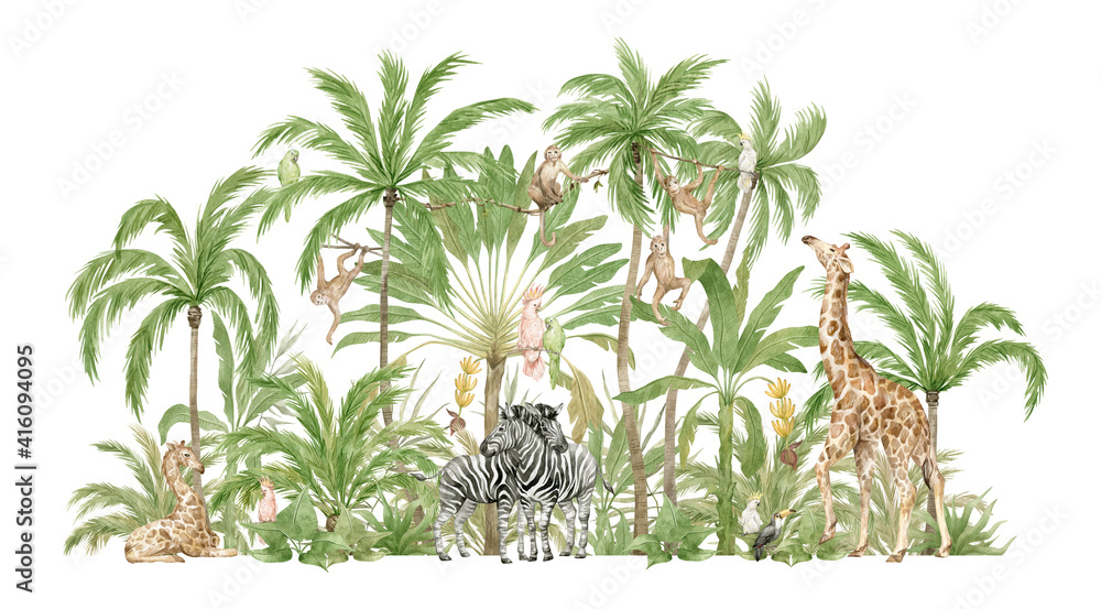 Obraz na plátně Watercolor safari animals and tropical palms