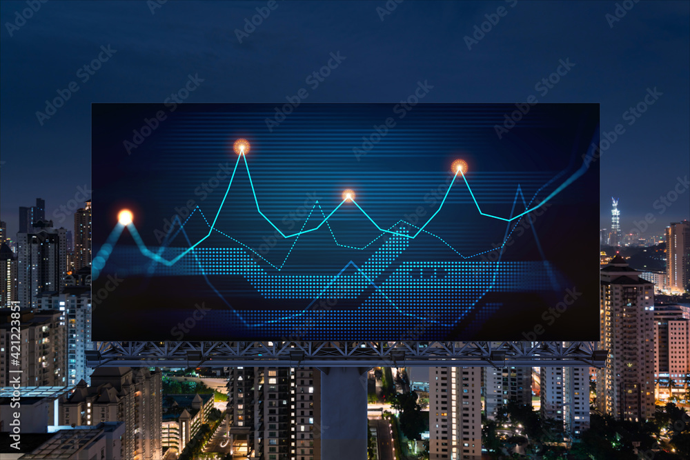 Obraz na plátně FOREX graph hologram on billboard, aerial night panoramic cityscape of Kuala Lumpur
