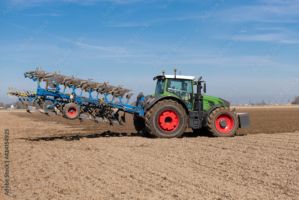 Obraz na plátně Agricultural technology | Tractor with mounted reversible plough in the field |
