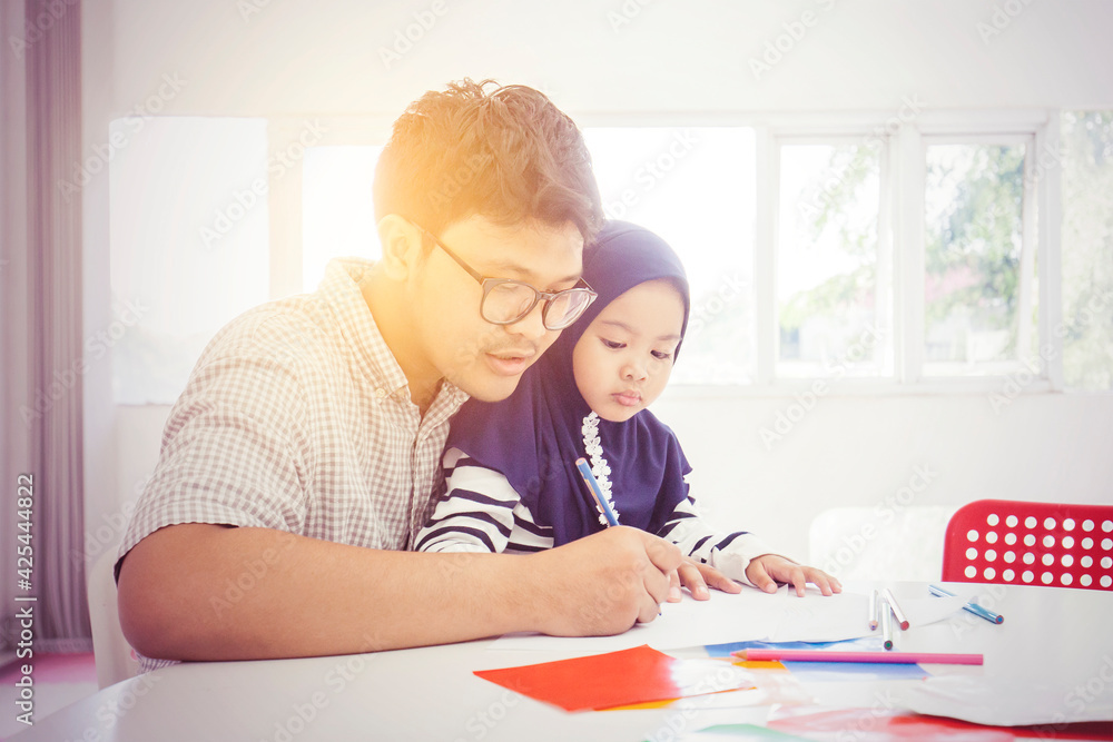 Obraz na plátně Young father teaching his daughter to write