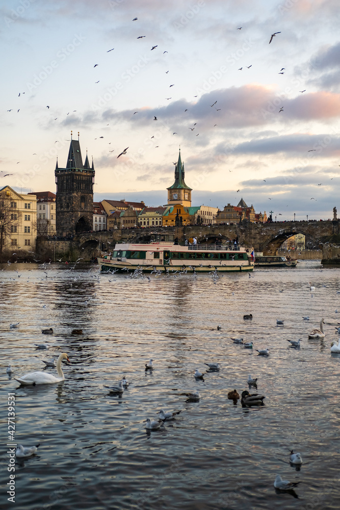 Obraz na plátně Clásica postal de Praga con catamarán navegando sobre el río Moldava