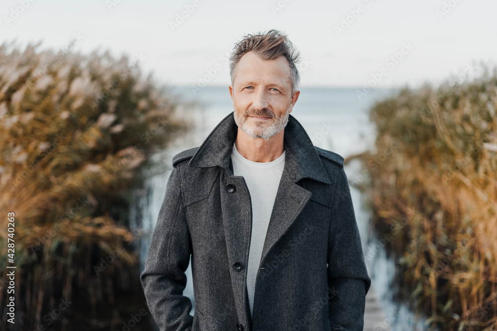 Obraz na plátně Quiet thoughtful man looking intently at the camera outdoors in nature