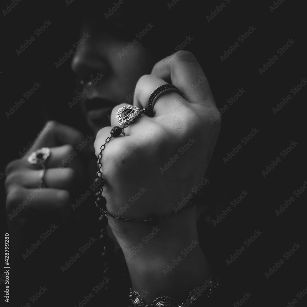 Obraz na plátně mujer sin rostro moderna rezando con mantilla anillos y un rosario