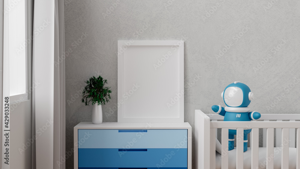 Obraz na plátně Mock up poster frame with astronaut droid for a baby shower 3D interior renderi