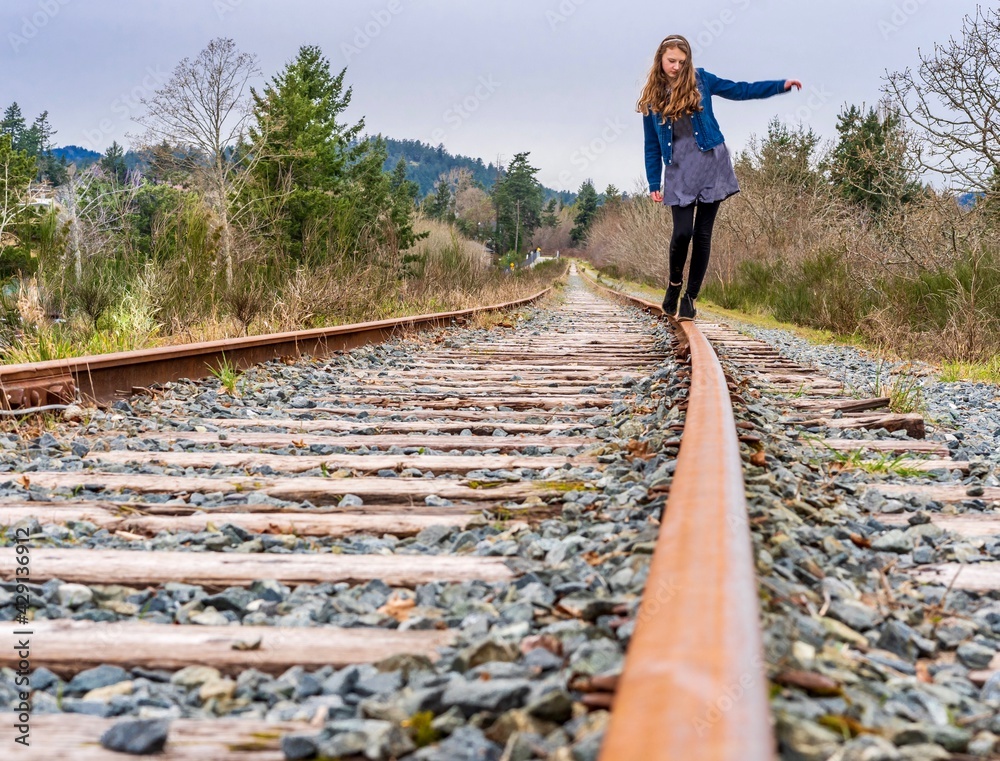 Obraz na plátně Girl balancing on old train track rail