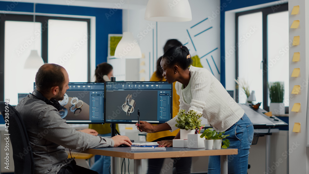 Obraz na plátně Diverse team of engineers working on computer at mechanical piece design cad sharing ideas about industrial project using dual displays setup