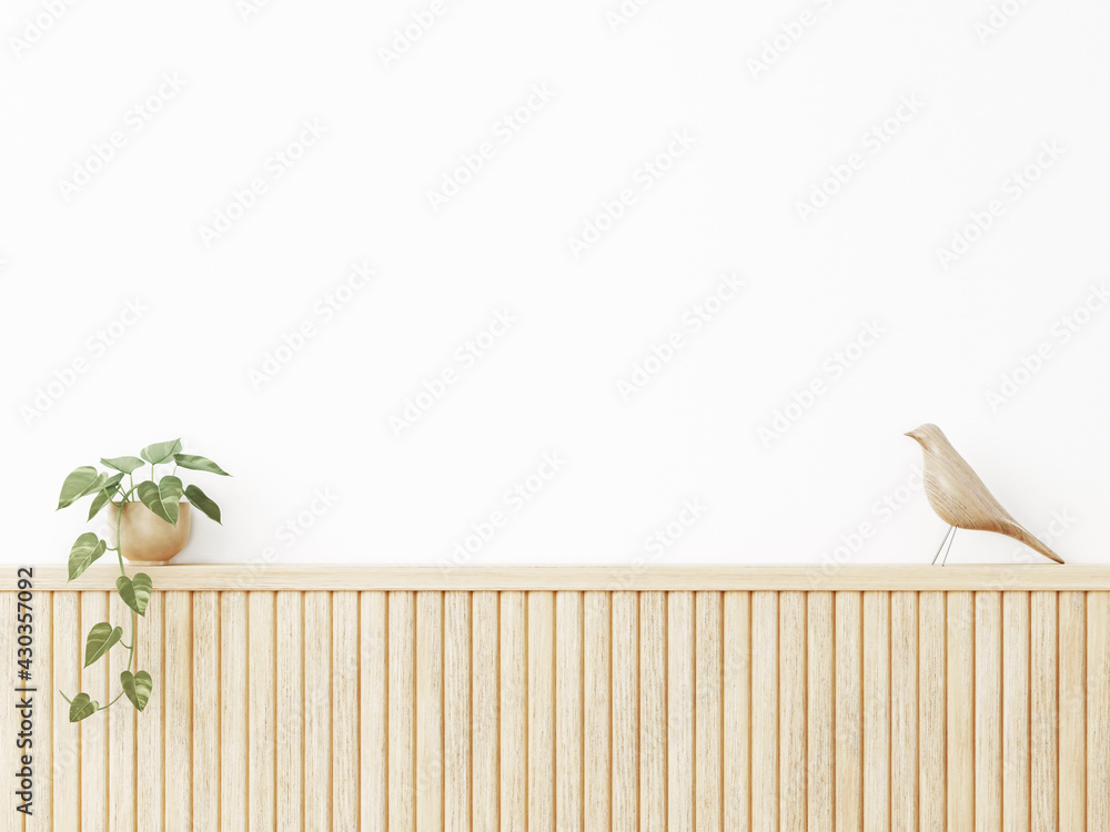 Obraz na plátně Interior wall mockup in warm neutral minimalist Japandi style with wooden slat wall decor, trailing green plant and bird on empty white background