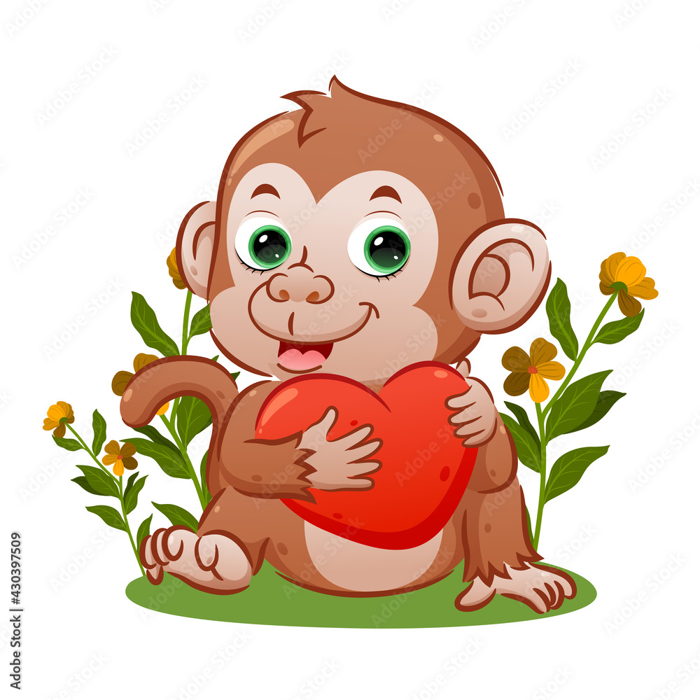 Obraz na plátně The cute monkey with the happy face is sitting and holding the big heart