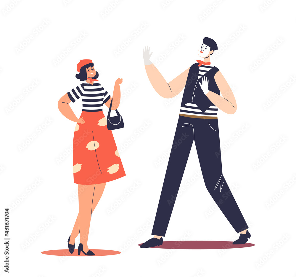 Obraz na plátně Typical french cartoon characters: male mime artist and female wearing stereotyp
