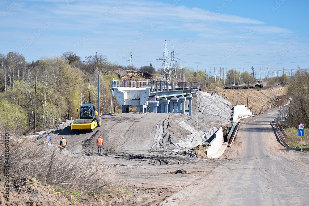 Obraz na plátně Construction equipment forms an artificial embankment and compresses the ground against the background of the construction of a new bridge